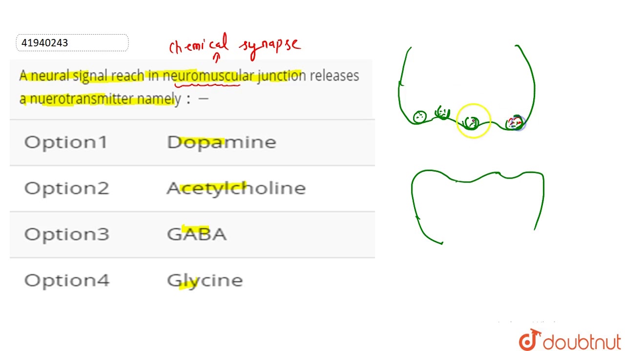 A neural signal reach in neuromuscular junction releases a nuerotransmitter namely `:-`A neural signal reach in neuromuscular junction releases a nuerotransmitter namely `:-`